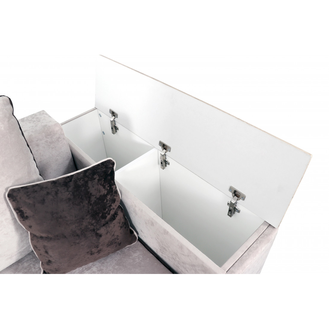 С одной стороны расположена боковина с нишей, с другой – ящики. Надежные петли с доводчиками добавляют комфортности использования мебели. Диван-трансформер может быть прямым, угловым и П-образным. Малые декоративные подушки входят в комплект дивана.