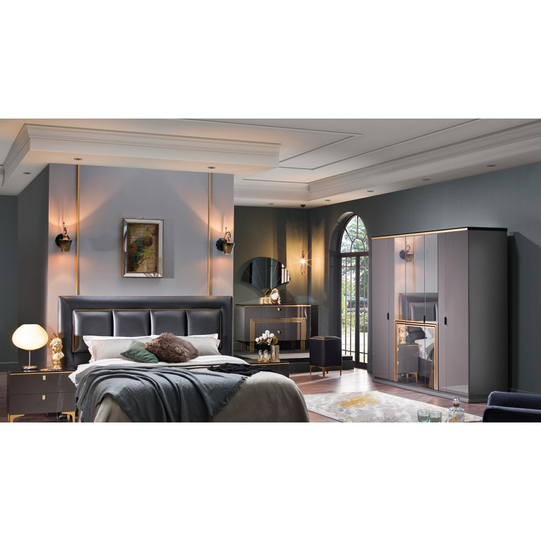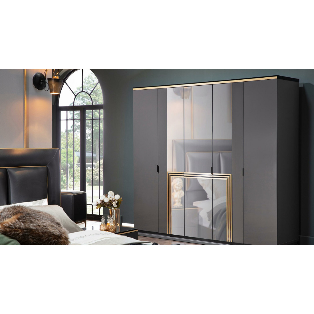 Шкаф Carlino Bellonaв вместительный предмет интерьера с пятью распашными дверьми, в котором поместится очень много одежды и вещей. Три зеркальные двери с золотым декором по центу, крайние двери цвета антрацит..