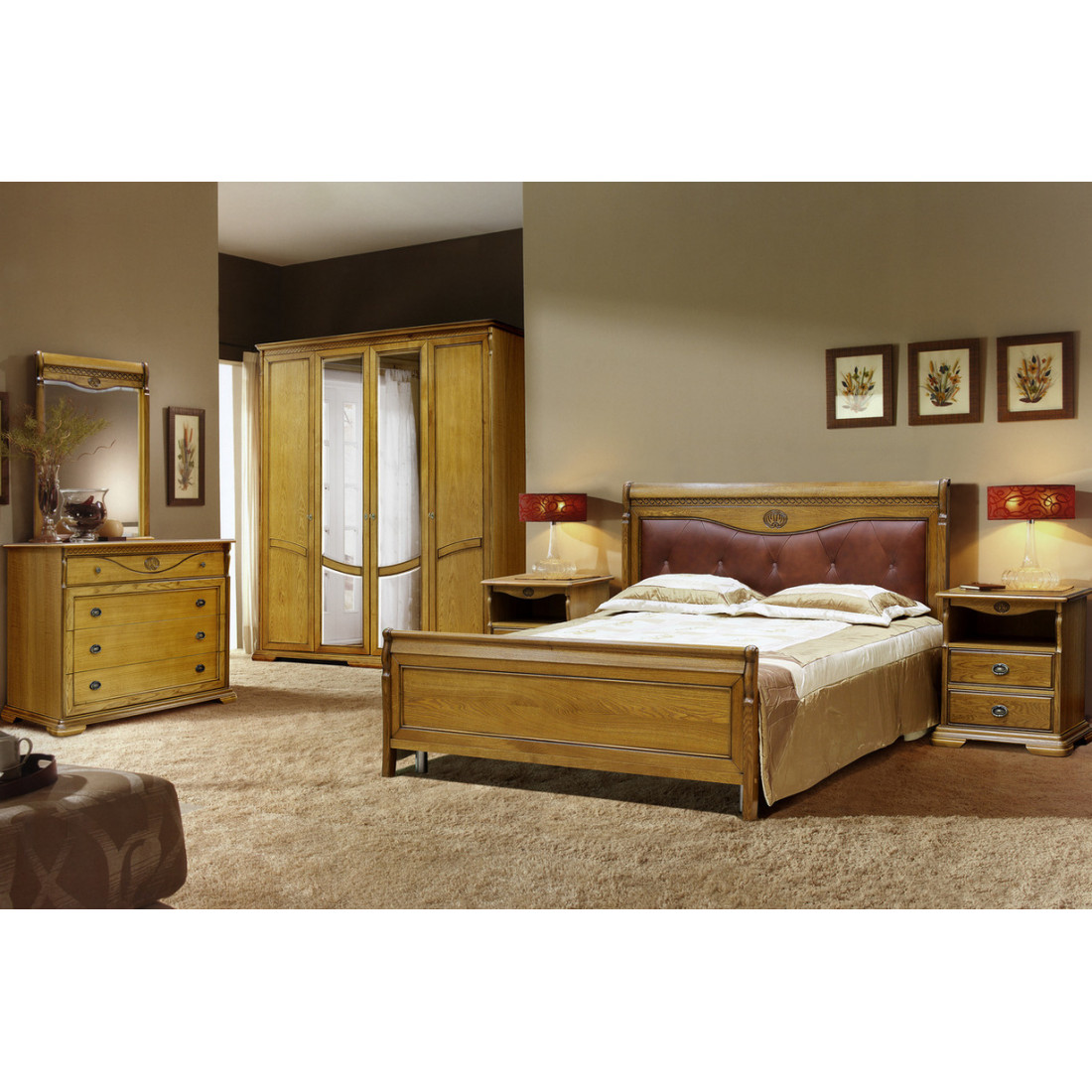 Изделия коллекции Лика выполнены из благородной древесины дуба.  Декоративные элементы с рамочно-филёнчатой конструкцией дверей, профильное фрезерование на передних стенках ящиков, карнизах, дверях, спинках кроватей и кромках крышек придаёт коллекции художественную выразительность и привлекательность. Спальня выполнена в цвете "Медовый дуб с золотой патиной".