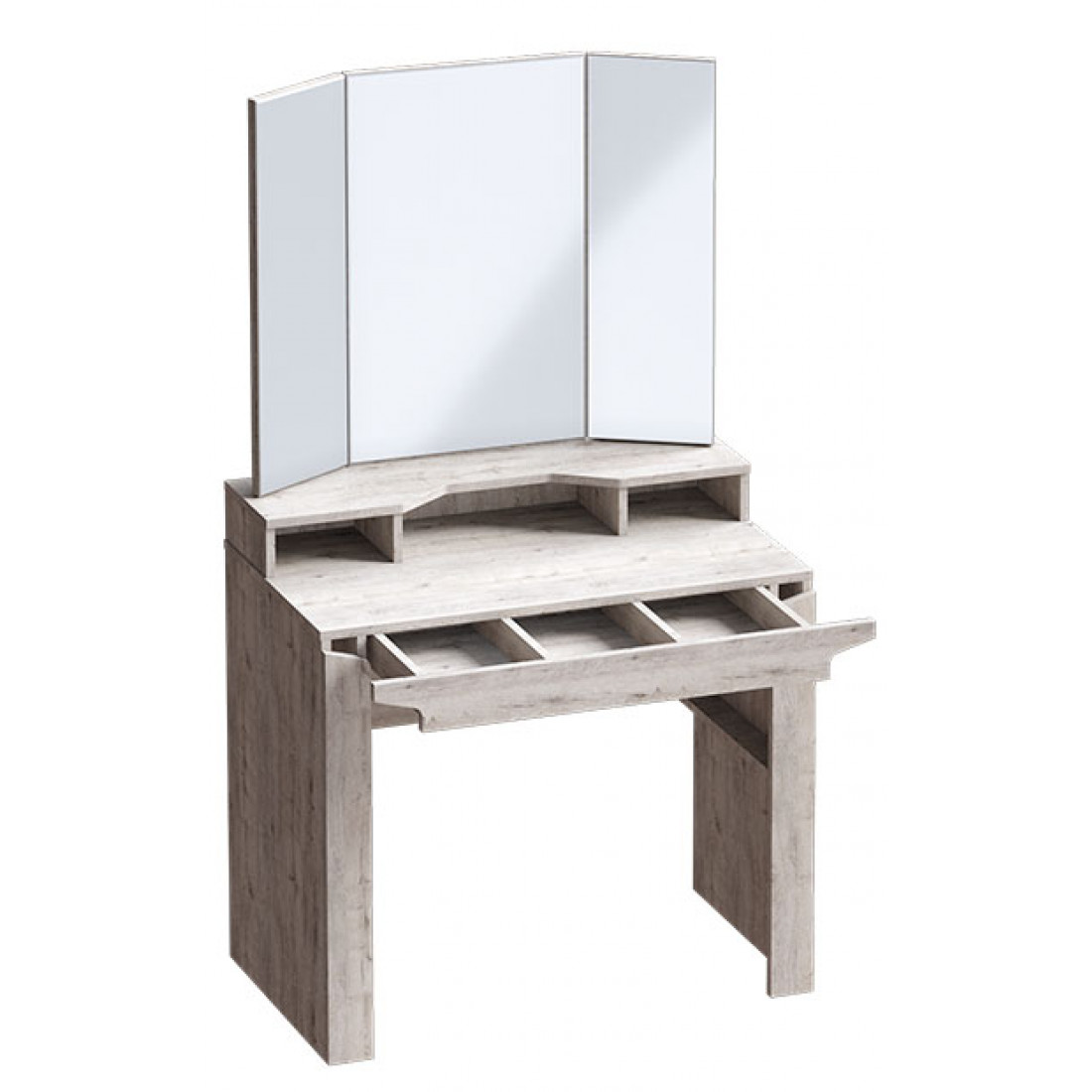 Туалетный столик с зеркалом из коллекции Соренто порадует ценителей лаконичных форм своими простыми, современными линиями и приятной светлой деревянной текстурой,создающей чувство покоя и комфорта в вашем доме. Удобная рабочая поверхность с дополнительной надстройкой позволит держать необходимые вещи под рукой, а выдвижной ящик служит отличным органайзером для хранения мелочей, косметики, украшений и аксессуаров.