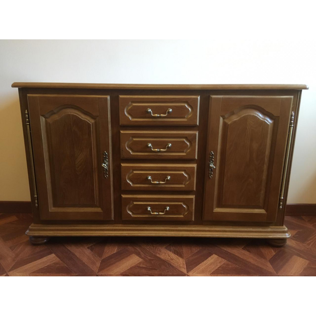 Классическая тумба с выдвижными ящиками и дверцами для гостиной из коллекции мебели "Давиль". Выполнена из массива древесины дуба, декорирована фрезерованием. Выполнена в цвете "Медовый дуб с золотой патиной".